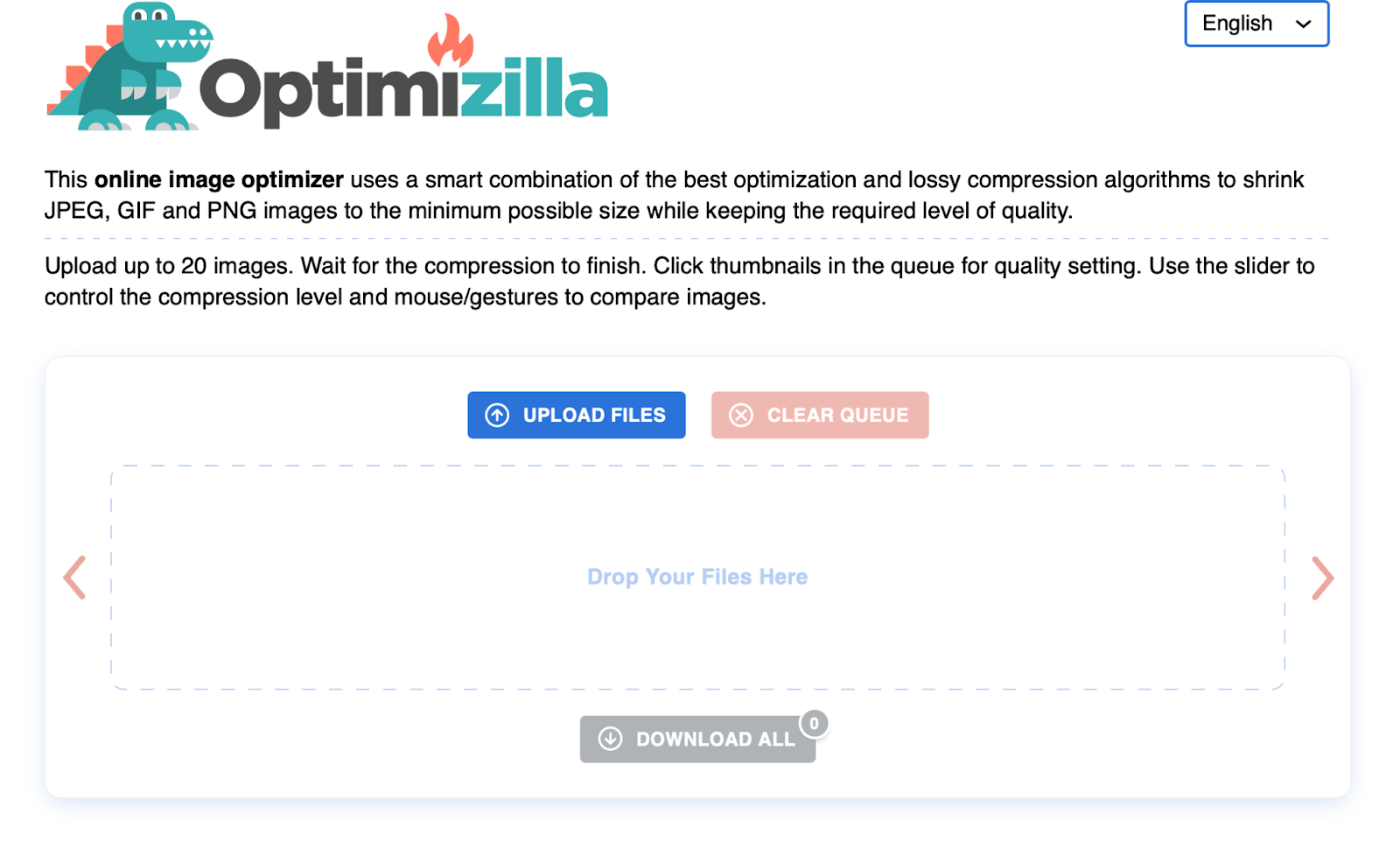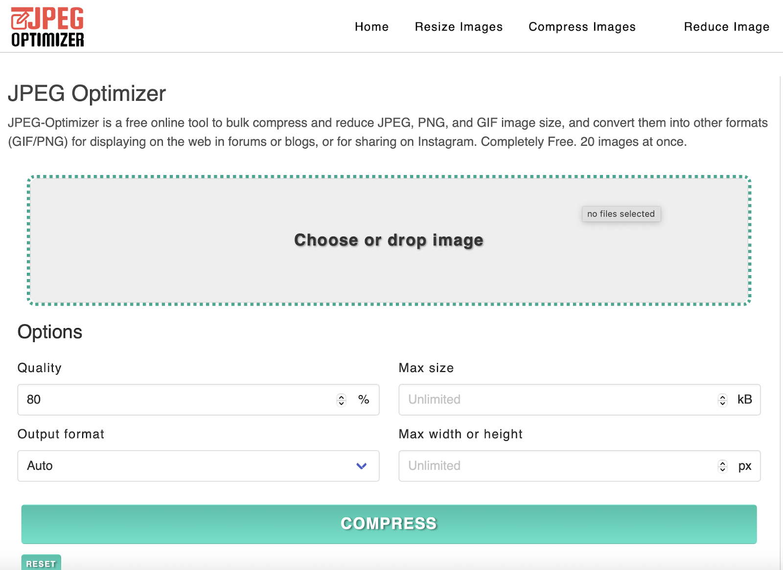 JPEG-Optimizer는 단순하고 가벼운 온라인 이미지 압축기 중 하나로, JPEG, PNG, GIF 포맷을 지원합니다. 인터페이스가 단순하며, 압축과 함께 이미지 크기 조정 옵션도 제공합니다.